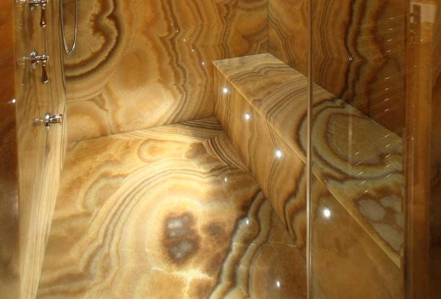 Роскошная душевая кабина, полностью отделанная крупными полированными плитами Onyx Arco Iris: стены и пол, декоративная скамейка. Стоит учитывать, что полированный мраморный оникс может быть весьма травмоопасным в условиях высокой влажности.