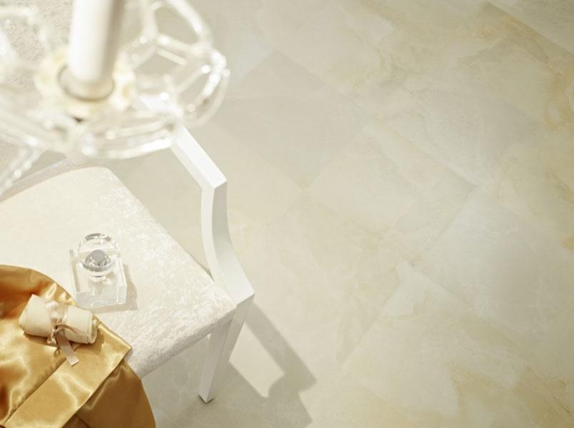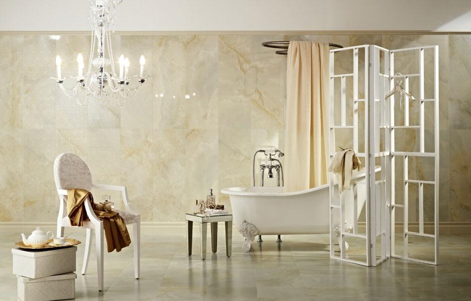 Пол и стены облицованы квадратной плиткой мраморного оникса, носящего название Onyx Bianco. Нежный пастельный тон камня дополнен прожилковато-узорчатой текстурой, которая завораживает. Камень привносит атмосферу благородства, лоска, выдержанного аристократичного стиля.