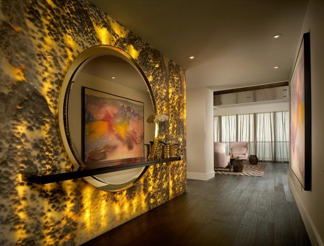 Стеновая панель изготовлена из подсвеченных изнутри крупных плит Onyx Black Cloud.