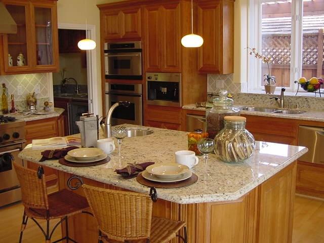 В отделке этой кухни использовался гранит Giallo Ornamentale - золотисто-бежевый, зернистый, с однородной структурой. Этот камень естественно дополняет интерьер с преобладанием желтой древесины.