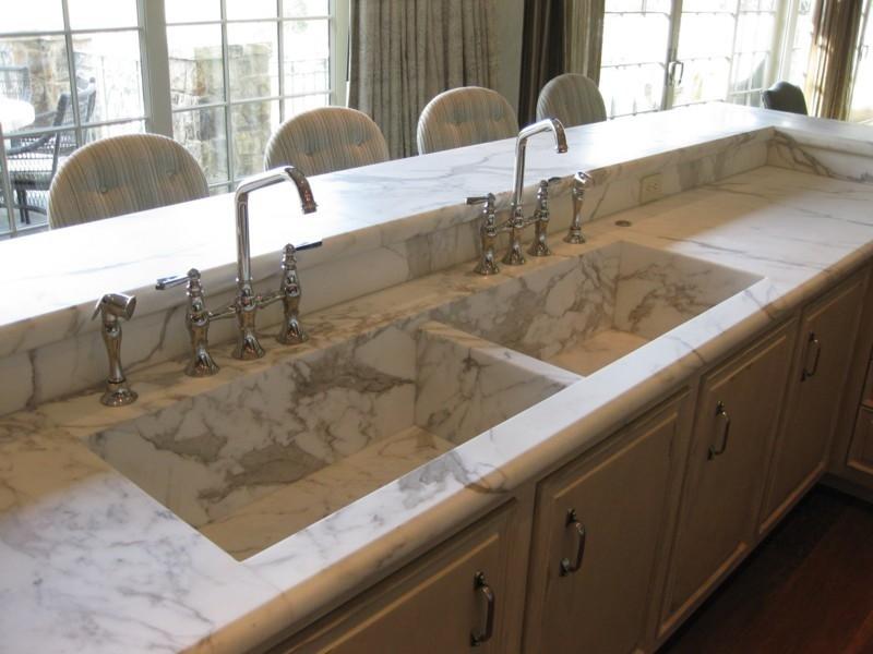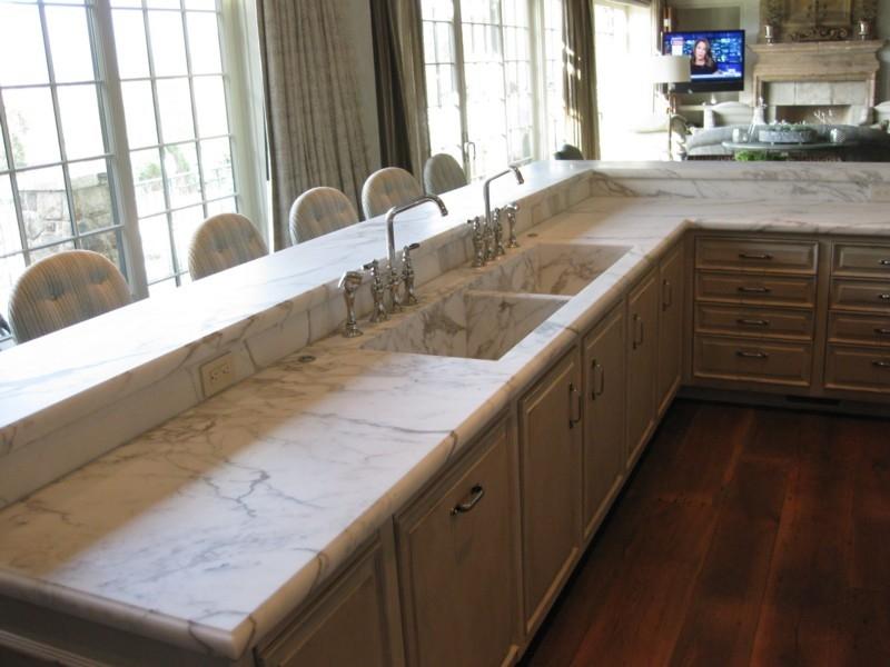 Рабочие столешницы по периметру окружены Г-образной барной стойкой из того же мрамора. Самая длинная часть стойки превышает 4 метра. Опять подчеркнем профессионализм каменных мастеров: на стойке незаметны стыки и швы.