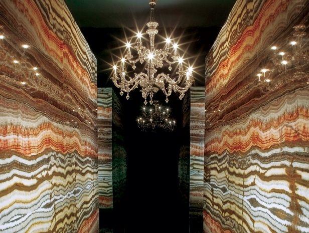 Стены галереи облицованы цельными полированными плитами Onyx Fantastico. Роскошная палитра камня с характерной полосчатостью порождает странное впечатление "зазеркалья".