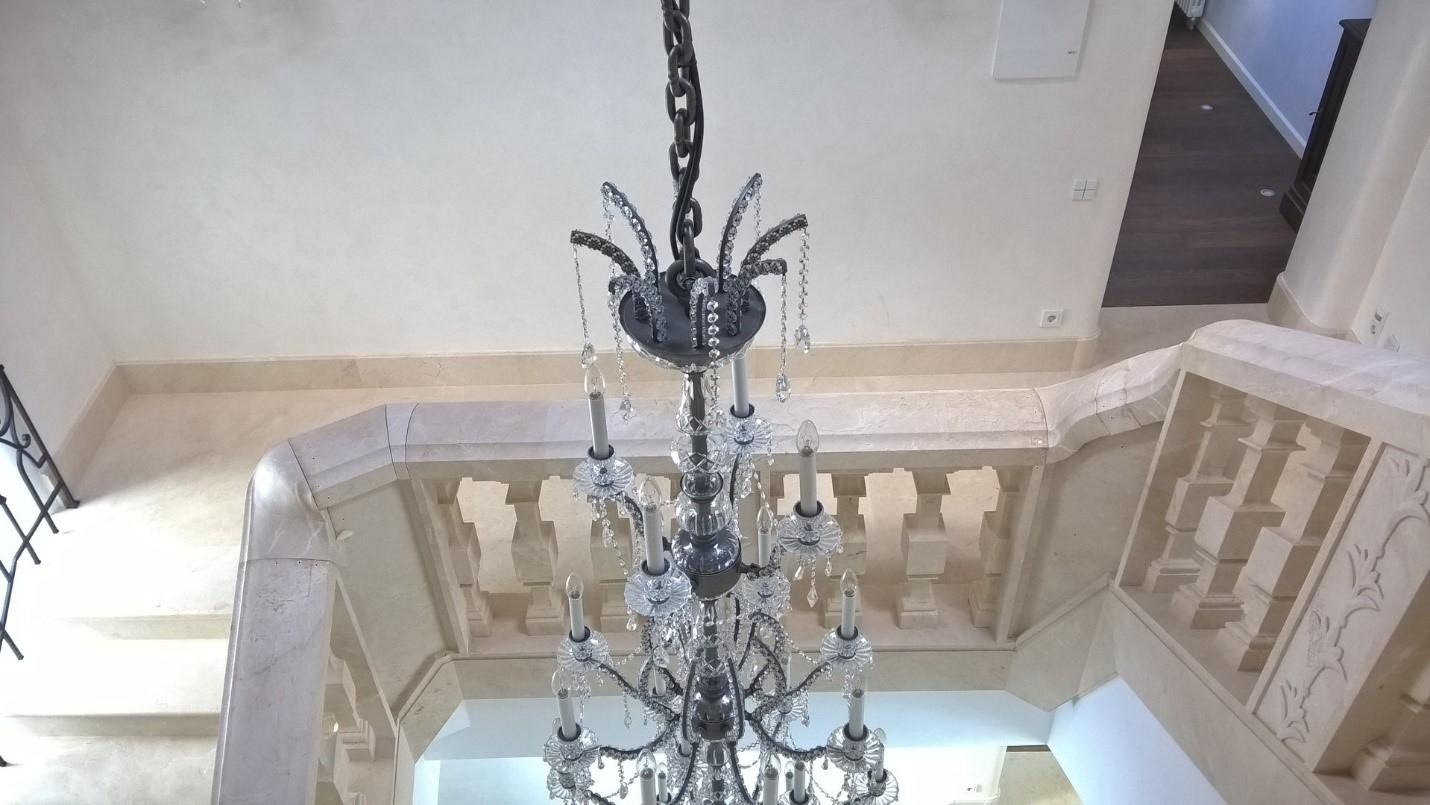 Это торжественная конструкция из лестницы с балюстрадой, расположенная по центру трехэтажной загородной резиденции. Главная идея проекта заключалась в том, чтобы с нуля воссоздать элегантную и роскошную лестницу в духе благородной старины. Заказчики желали создать в своем вполне современном доме атмосферу хорошо отреставрированного дворца.