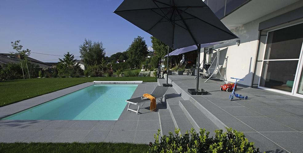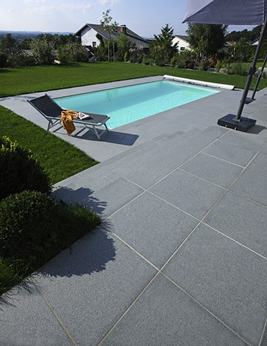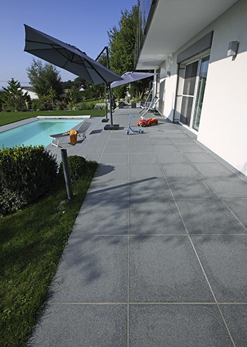 Плиты китайского гранита Padang Dark использованы для отделки пространства вокруг загородного дома. Ими облицована небольшая терраса, площадь вокруг бассейна, ландшафтная лестница в четыре ступени.