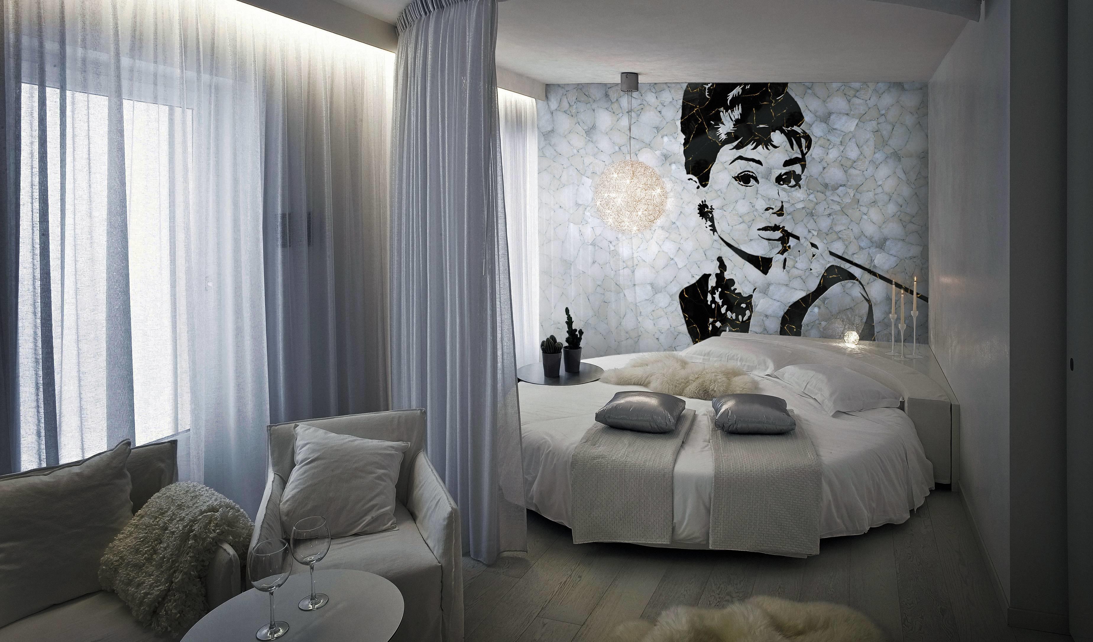 Реализованный дизайн-проект светлой спальни в романтическом стиле. Одна стена представляет собой цельную плиту White Silver Quartz с нанесенным портретом Одри Хепберн. Камень весьма органичен в интерьере, созданном для современной молодой женщины.