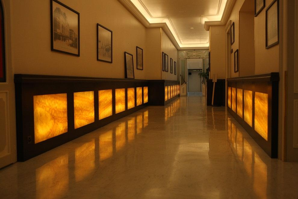 Нижняя часть стены облицована темным деревом с вставками из мраморного оникса Alabastro. Внутрь панно равномерно встроены светодиодные лампочки. Проходя через тонкую 2-сантиметровую плиту камня свет становится мягким, приглушенным, интимным.