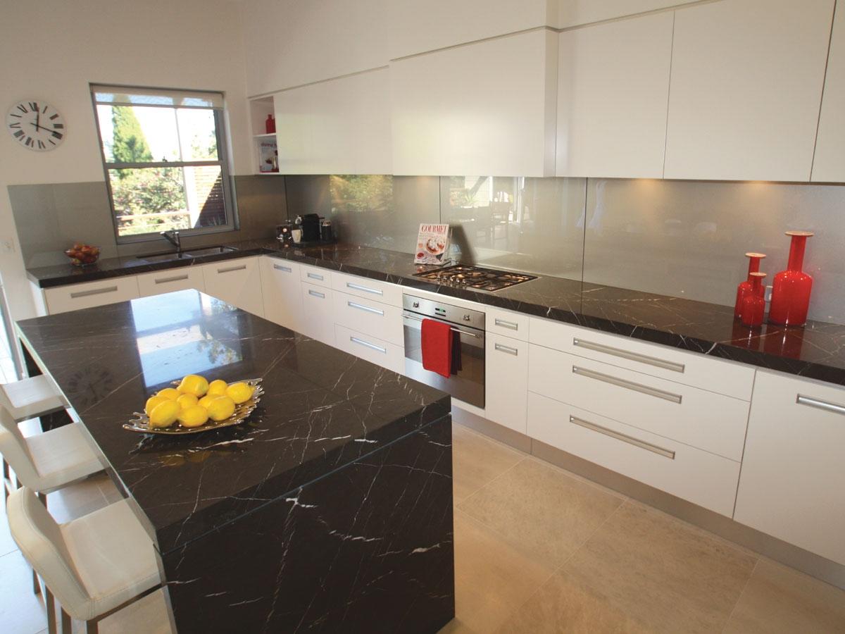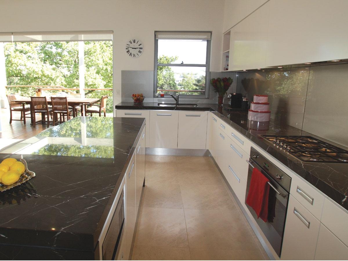 Элегантный и стильный мрамор Pietra Grey покрывает все столешницы этой просторной кухни: рабочие поверхности по периметру, а также стол-остров модной П-образной формы.