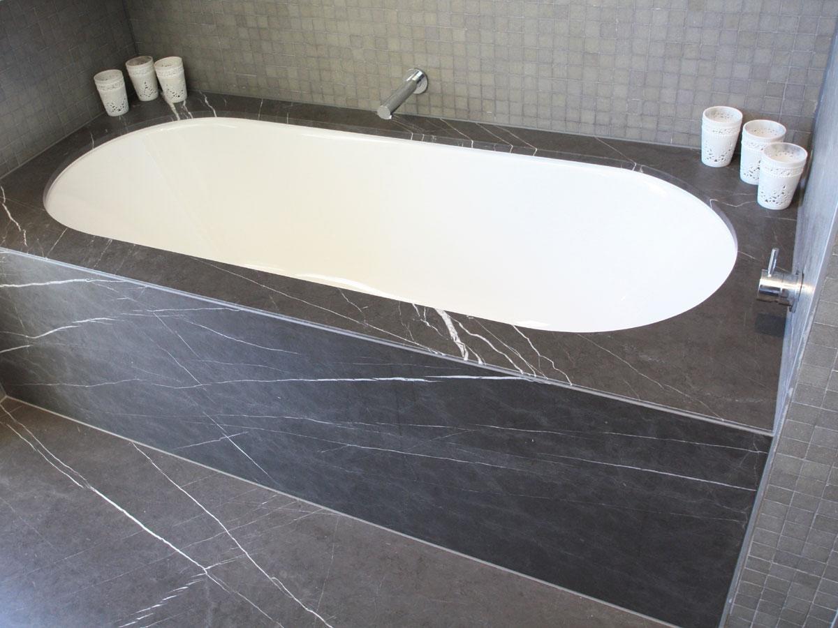 Для отделки ванны заказчик выбрал благородный темно-серый мрамор с белыми графическими прожилками Pietra Grey. Этот камень органично встраивается в любую интерьерную композицию. Он одинаково востребован и среди ценителей сверхсовременного дизайна, и среди консерваторов. Pietra Grey - всегда актуальная классика.