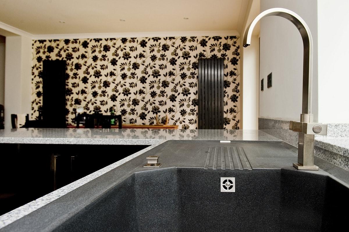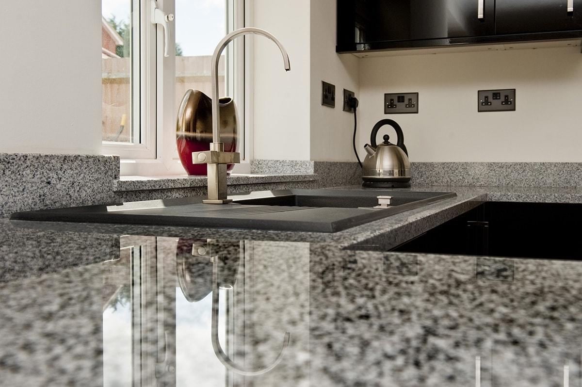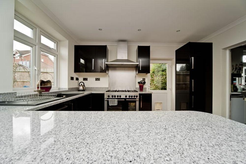 Перед нами проект стильной кухни в загородном доме. Все столешницы выполнены из светлого зернистого гранита Platinum White. Для него характерна однородная текстура с частым узором темных мелких зернышек. Этот материал подойдет для проекта любой стилистической направленности. Что не менее важно, Platinum White достойно выдерживает довольно агрессивные условия кухонной среды: механическую нагрузку, повышенную влажность, контакт с бытовыми кислотами.