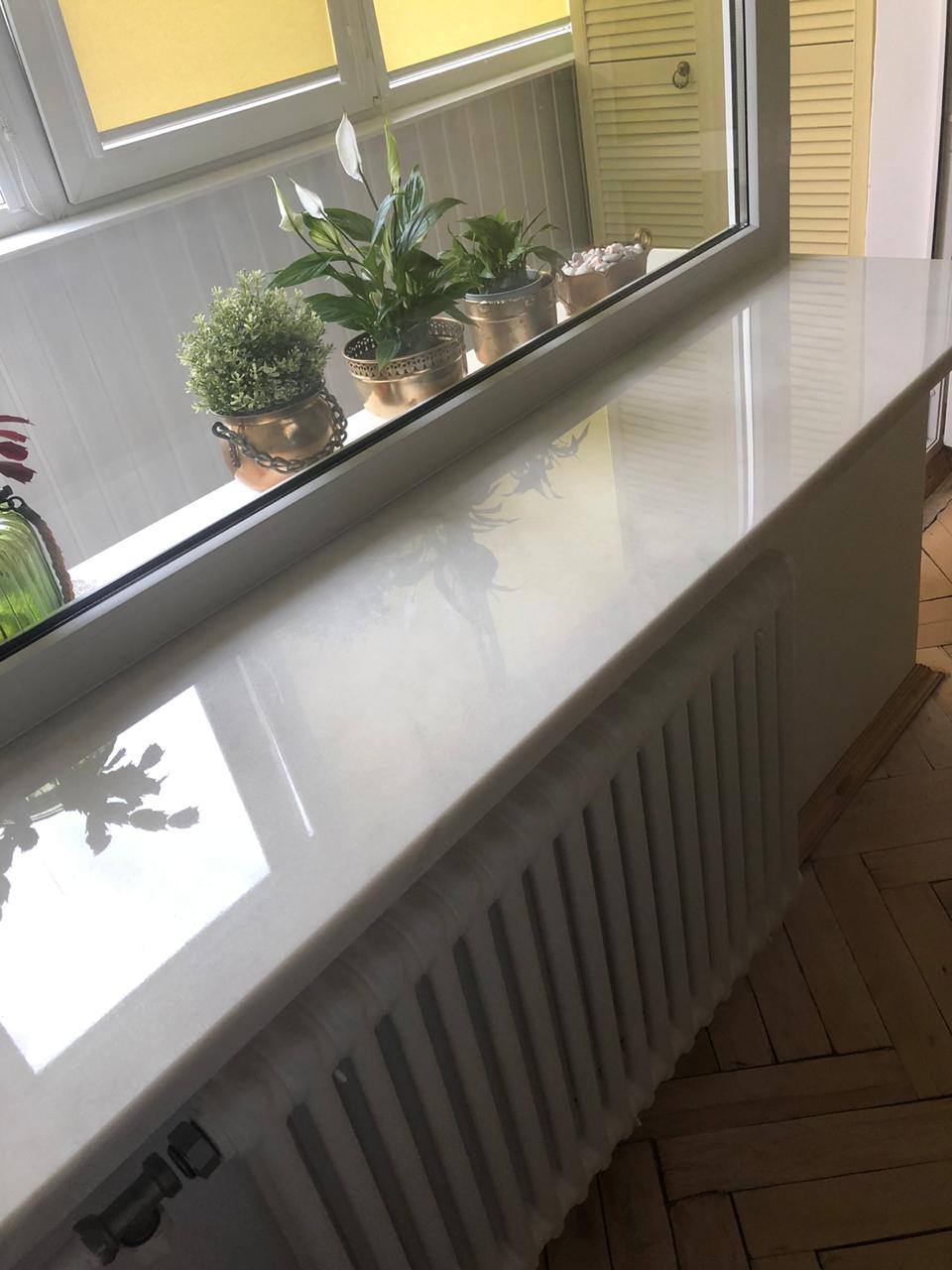 Изготовление и монтаж подоконника из белого Полоцкого мрамора для частного клиента в Санкт-Петербурге.