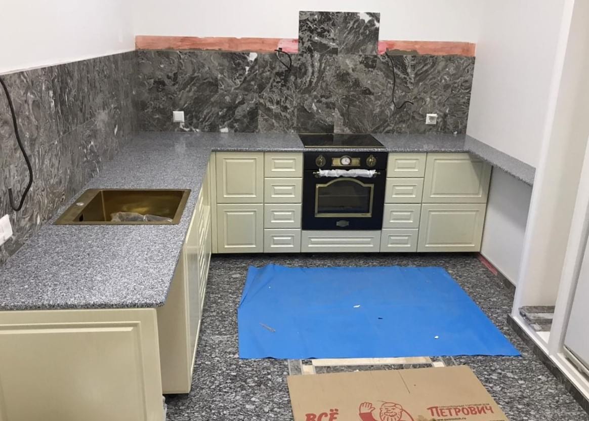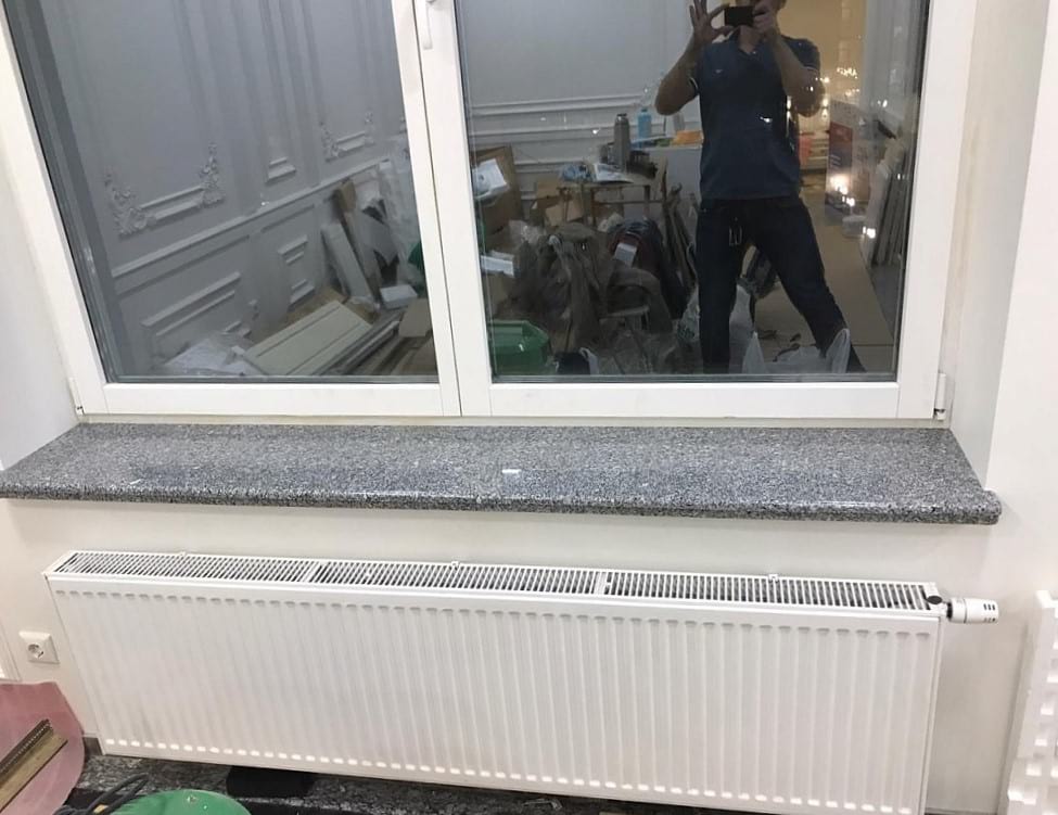Изготовление и монтаж двух подоконников и большой угловой столешниц из серого гранита Bella White. Из обрезков камня по просьбе клиента была так-же сделана маленькая полочка для ванной комнаты.