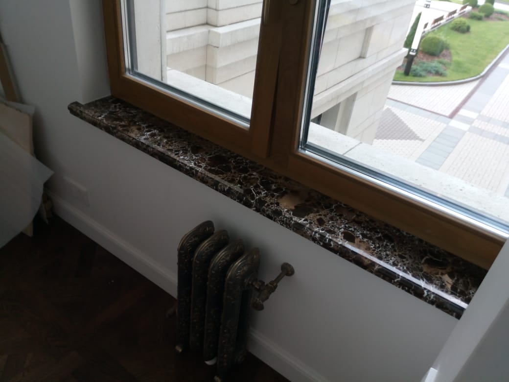 Изготовление и монтаж подоконника и небольшой столешницы для тумбы из мрамора Emperador Gold.