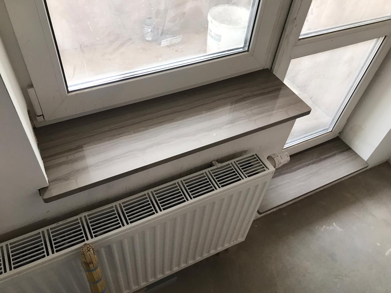Изготовление и монтаж двух подоконников и балконного порога из Итальянского мрамора Striato Elegante для частного клиента в Санкт-Петербурге.