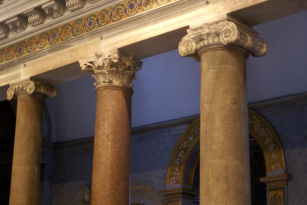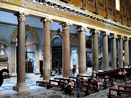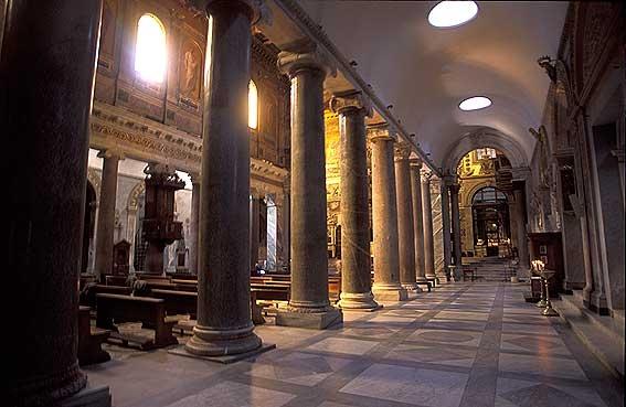 Базилика Санта-Мария-Маджоре - одна из четырех главных цервей Рима. Основание здания пришлось на 356 год, но его строительство и украшение продолжалось до 1750 года. Колоннада представлена рядами высоких колонн, облицованных полированным красно-коричневым гранитом. Гранитные колонны выполняют несущую функцию. Точная дата их установки не известна, но мы можем утверждать, что это произошло на первых этапах строительства.
