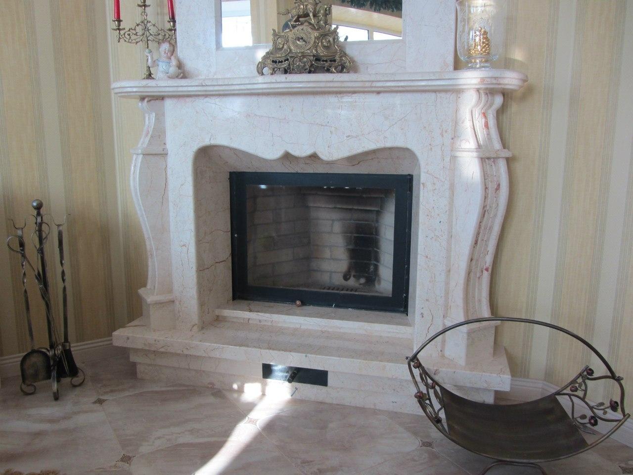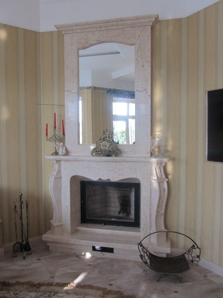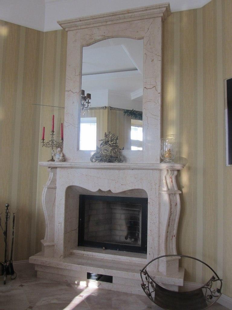 Резной высокий каминный портал с зеркалом выполнен из удивительного нежно-розового мрамора Rosalia.