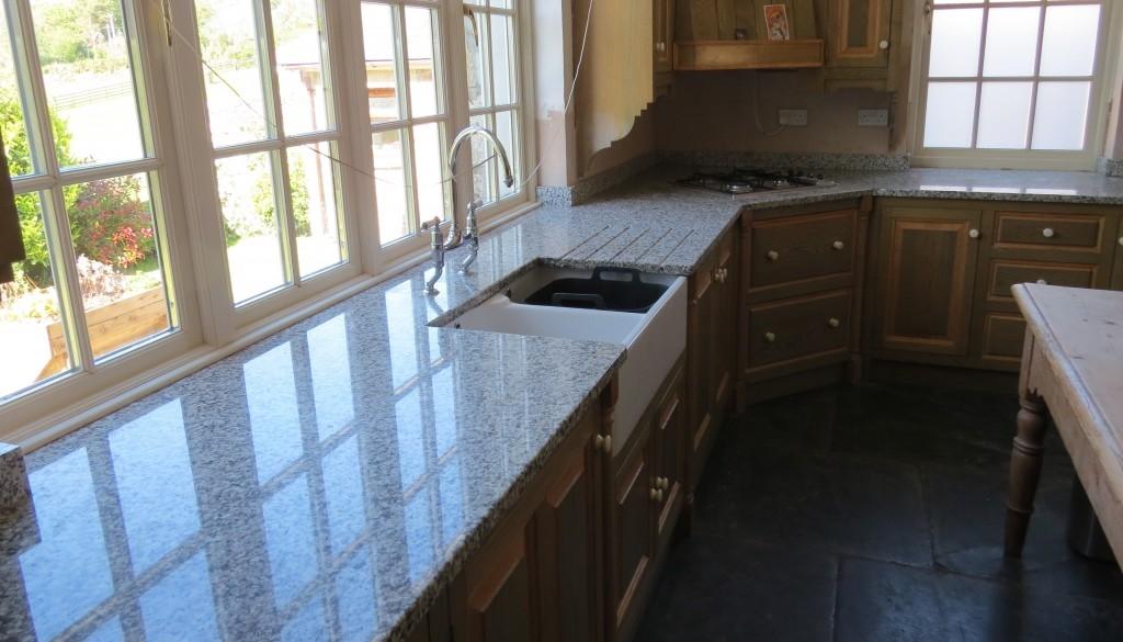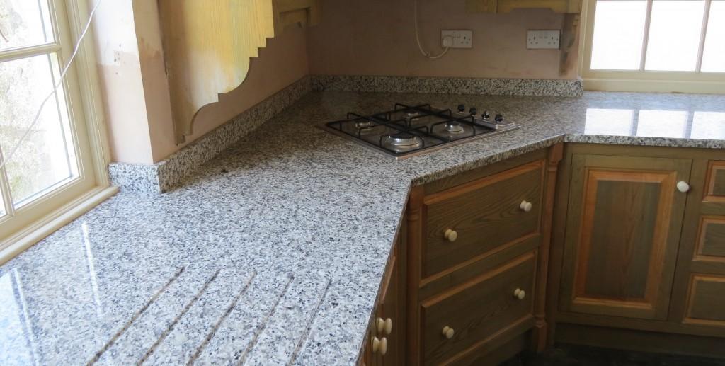 Столешница для кухонного гарнитура вырезана из трехсантиметрового полированного слэба гранита Bianco Sardo. При беглом взгляде этот итальянский гранит производит впечатление весьма скромного и невыразительного материала. Но при ближайшем рассмотрении его рисунок начинает согревать пастельными оттенками серого и бежевого цвета. А конечный цвет изделия зависит от того, какой оттенок преобладает в окружающем пространстве.