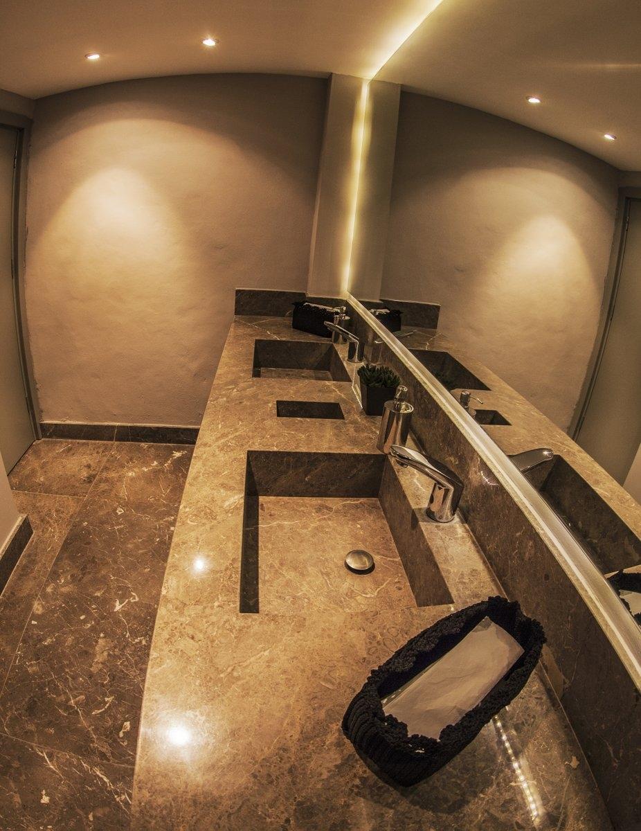 Серо-коричневый прожилковатый мрамор Savana Grey играет главную роль в интерьере уборной.
