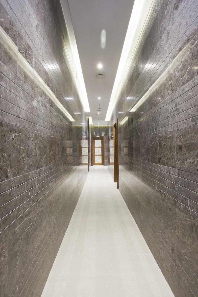 Все стены коридора облицованы серо-коричневым мрамором Savana Grey. Его приглушенный рисунок органично встраиваются в пространство, привнося в него благородство и элегантность.