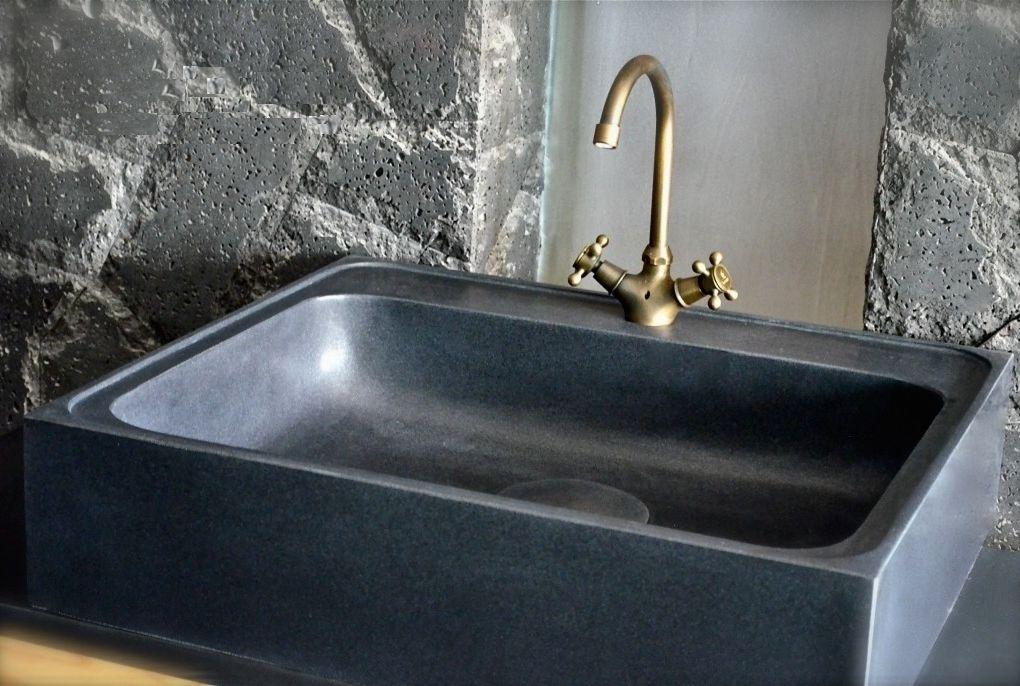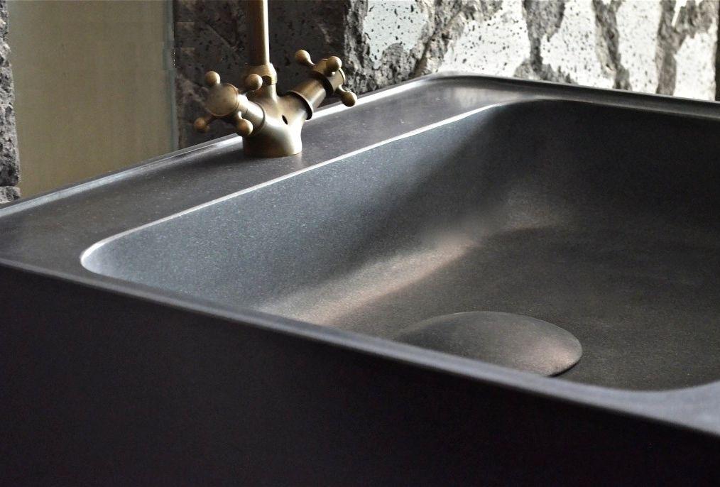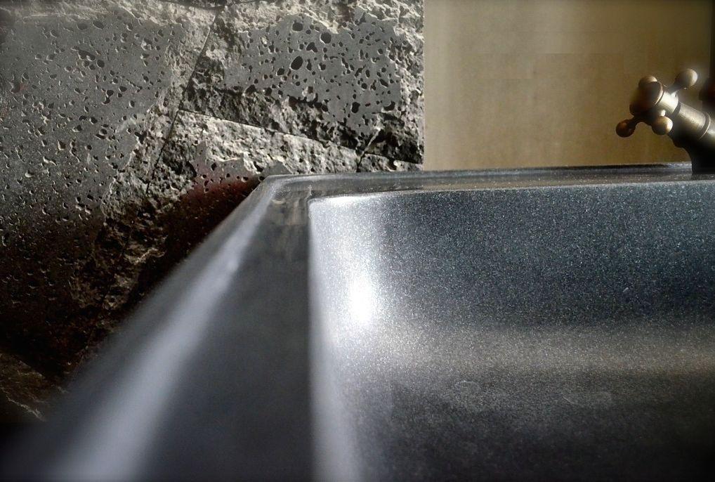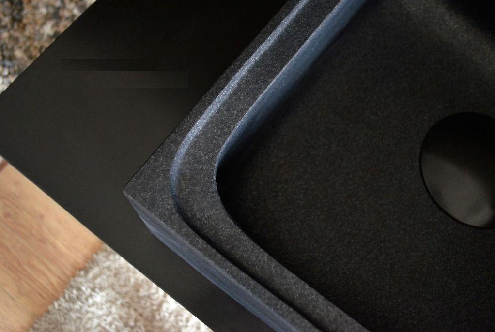На первый взгляд кажется, что мойка выполнена из искуственного материала на основе гранитной крошки, но это только видимость. Изделие вырезано из цельного блока натурального черного гранита Shanxi Black. На завершающем этапе камень приобрел лощеную фактуру поверхности, дающую этот бархатистый матовый блеск.
