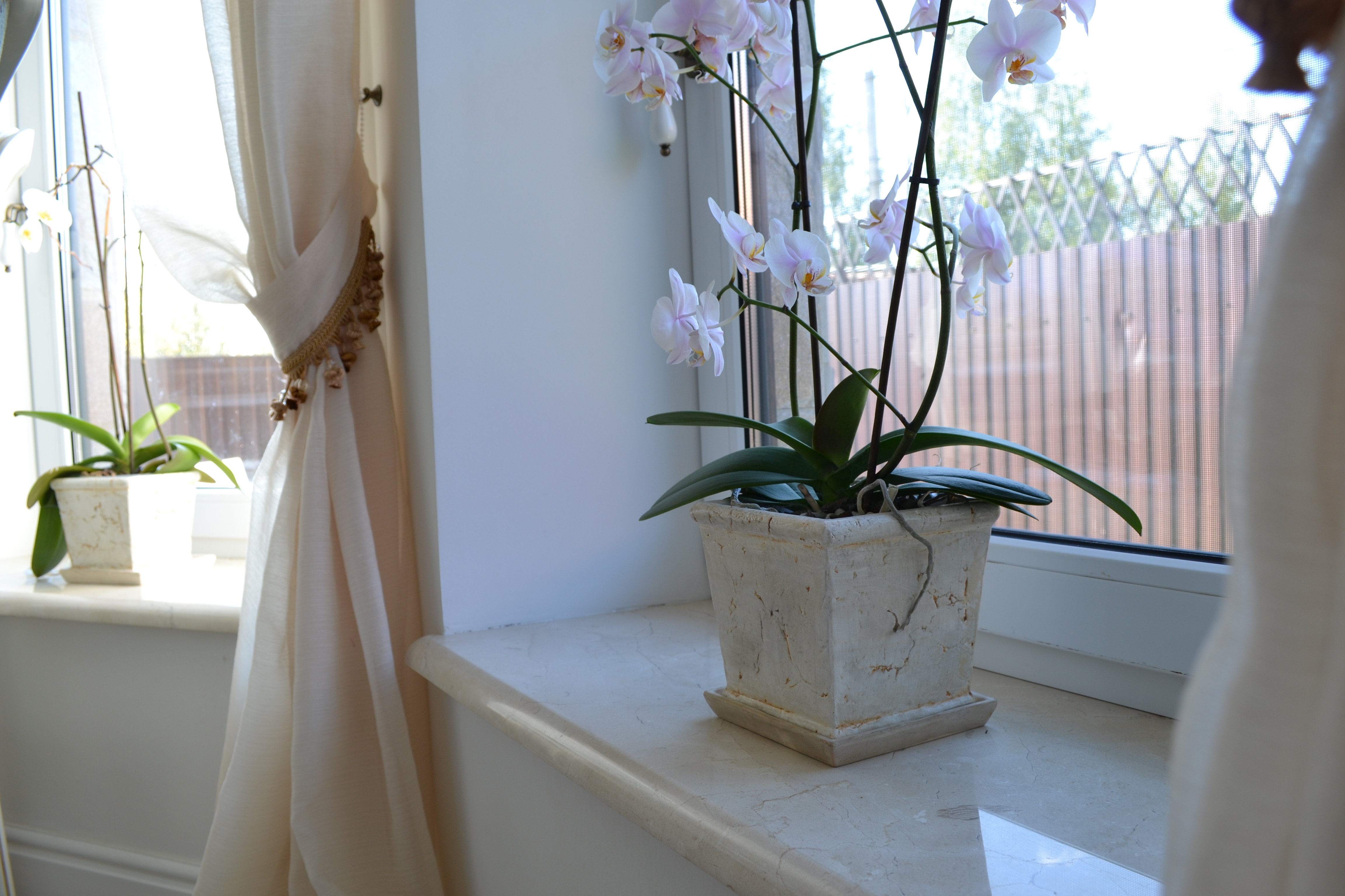 Все подоконники первого этажа представляют собой полированный мрамор Crema Marfil. Этот легендарный испанский камень особенно востребован среди ценителей классических интерьерных решений. Нежно-бежевый оттенок и легкие, едва заметные прожилки и включения.. Элегантный и нежный, Crema Marfil органичен в любом интерьере. Он привлекателен, но не претендует на главенство в декоре.