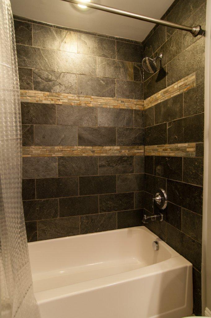 Стены вокруг ванны облицованы кварцитосланцем Silver Shine Slate - мерцающим, серебристо-графитовым, камнем с колотой, рельефной фактурой. Поверхность камня сохранила естественный, необработанный скол, что придает отделке изысканную небрежность. Серая отделка декорирована полосами из частиц более светлого сланца.