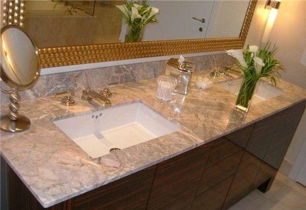 Элегантная столешница под раковины выполнена из мрамора Fior di Pesco Carnico. Удивительный камень, создающий атмосферу нежности и теплого света — светло-серый с розовыми прожилками. Утонченный и стильный материал для эксклюзивного интерьера.