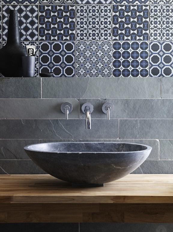 В данном проекте он гармонирует с необработанным деревом столешницы, с потертым мрамором раковины, с керамической плиткой с рисунком-орнаментом, с сантехникой "металлик".