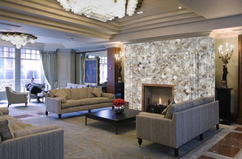Камин в просторной гостиной облицован крупными плитами Smokey Quartz. Изделие интересно тем, что под все каменной панелью равномерно расположены источники освещения. При конструировании такого камина следует помнить, что кварцевые плиты не должны перегреваться. Кварц выполняет сугубо декоративную роль, находясь в отдалении от источника огня.