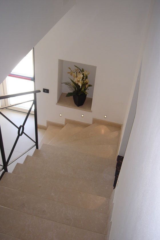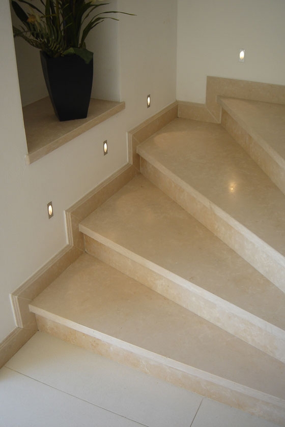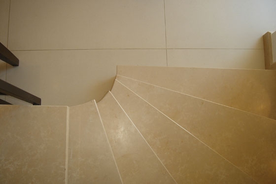 Лестница облицована лощеным мрамором Crema Nuova - элегантным бежевым, с аккуратными вкраплениями более светлого минерального вещества. Такой камень эстетичен и легко встраивается в любой интерьерный проект. Фактура лощение придает камню мягкий бархатистый блеск. Что не менее важно для обитателей дома, лощеный мрамор менее травматичен, чем полированный. Ведь, прежде всего, домашняя лестница должна быть безопасной.
