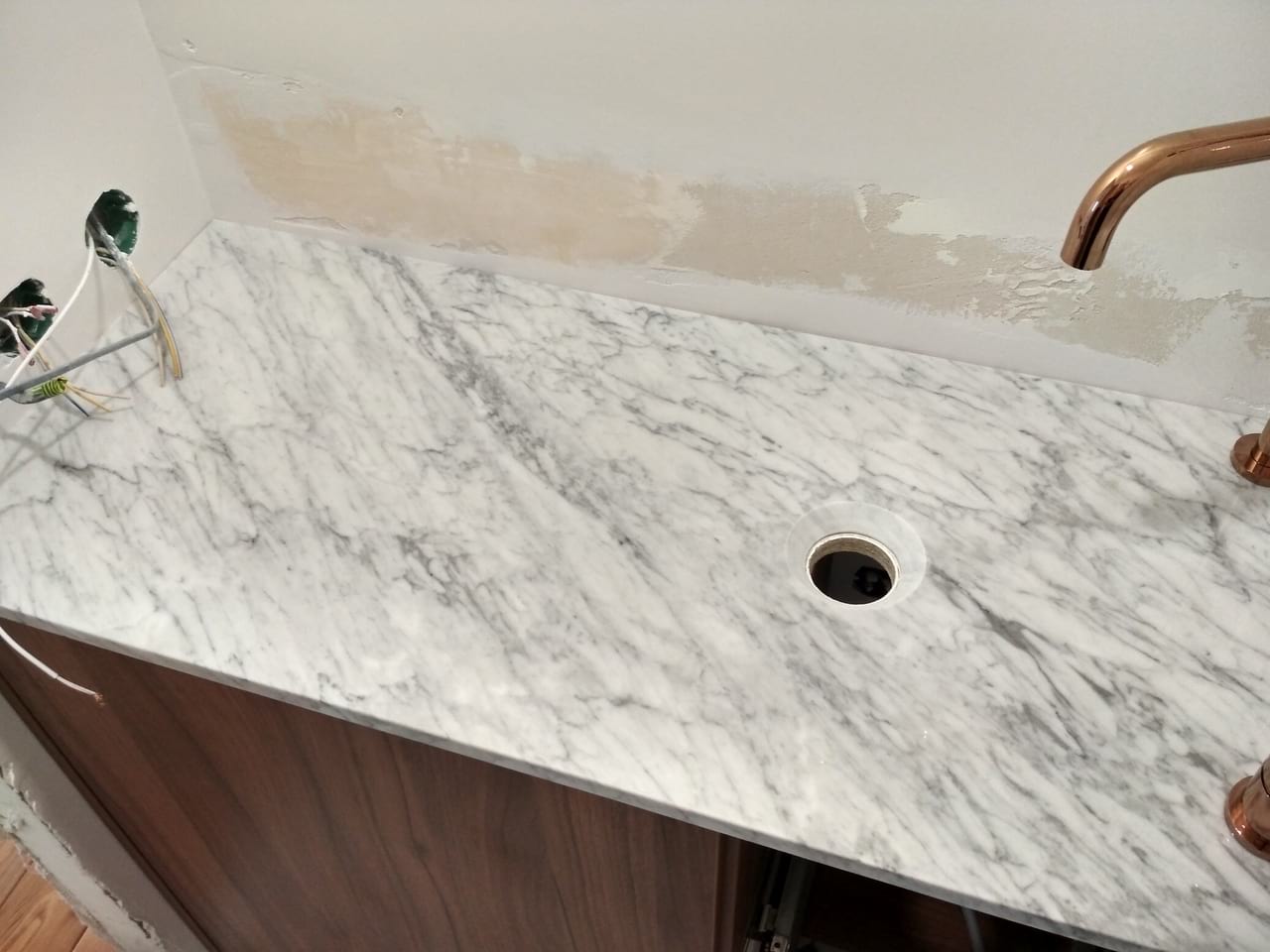 Изготовление столешницы в ванную из остатка Bianco Carrara C (серая Каррара).