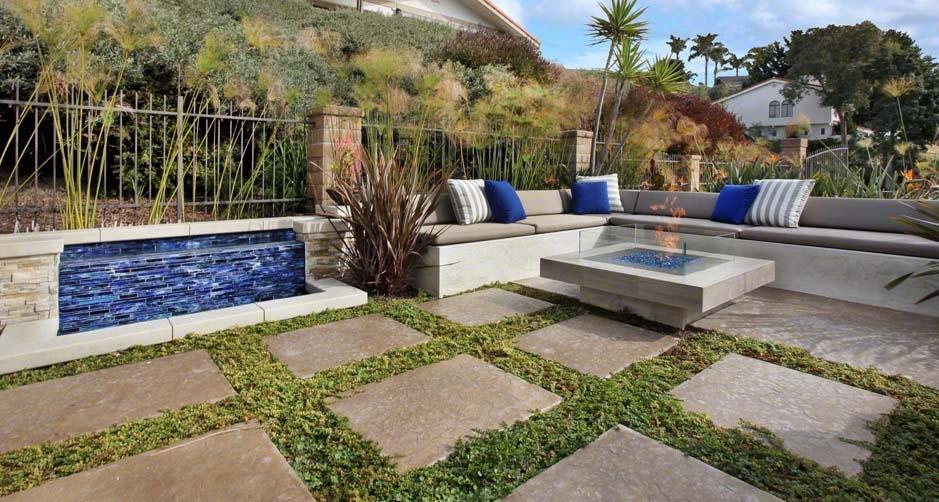Архитектор выбрал привлекательный вариант для мощения территории: квадратные плиты Travertine Walnut разложены с зазорами, заполненными растительностью.
