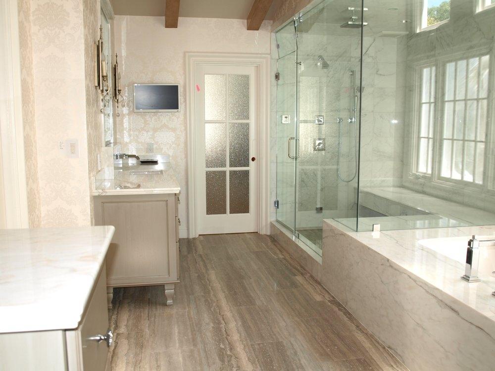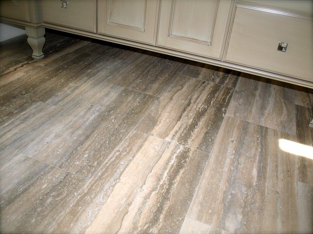 Для отделки пола в ванной комнате были использованы плиты Travertino Striato с выраженной полосчатостью (распиловка Vein Cut). Монтажники пытались сохранить цельность рисунка, но не удалось - стыки между плитами заметны невооруженным глазом. Поэтому в таких случаях мы рекомендуем облицовку цельными слэбами или плитами очень крупного формата.