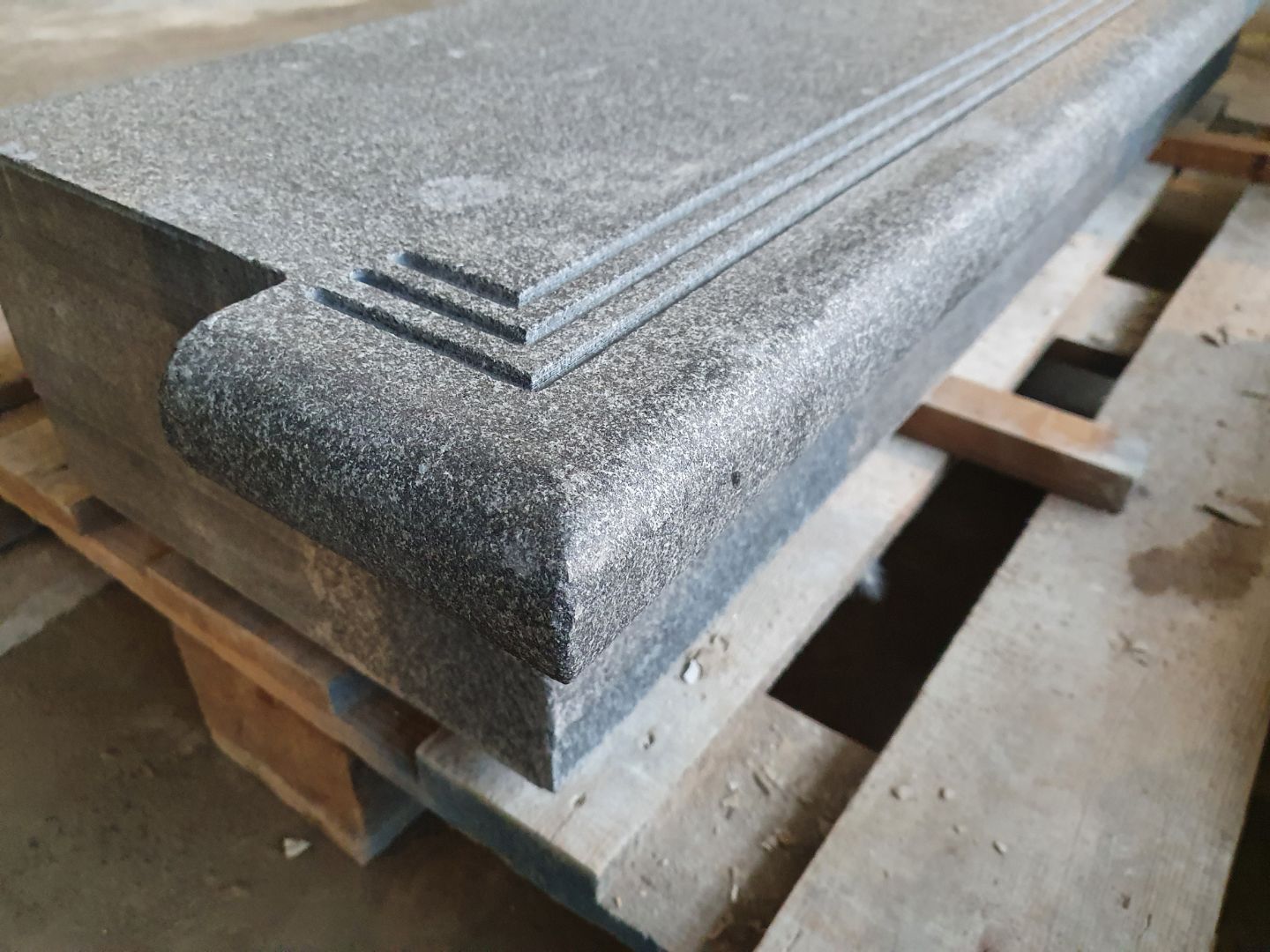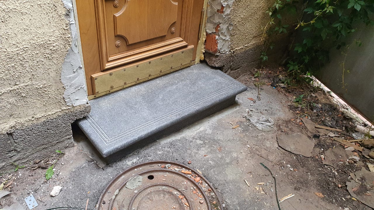 Изготовление и монтаж пяти цельных ступеней из гранита G684 Berry Black. Толщина ступеней 170-190мм, а на поверхности каждой ступени были вырезаны канавки глубиной 6мм. Обработка поверхности - термление.