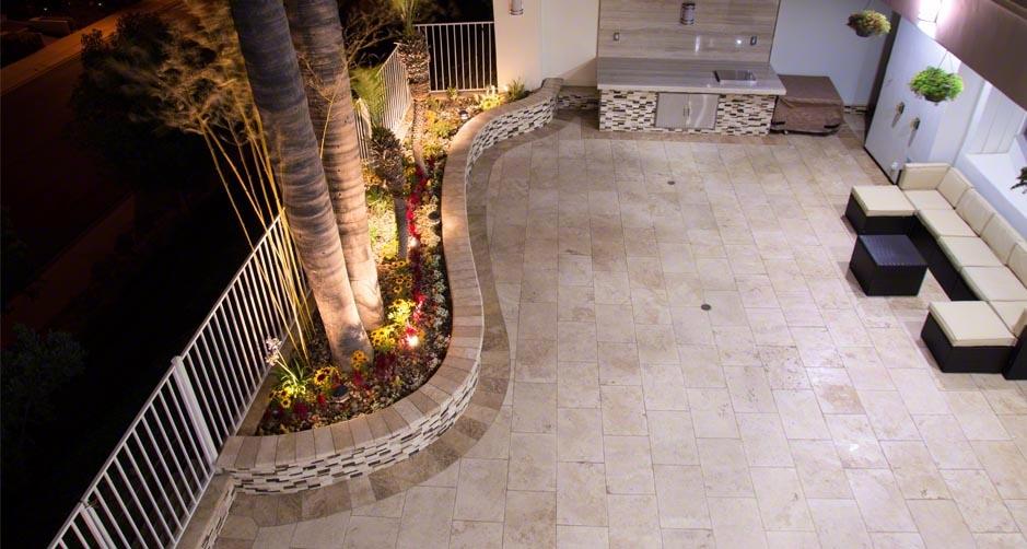 В данном проекте речь шла о кухне, расположенной на террасе загородного дома в одной средиземноморской стране. Пол террасы облицован травертином Travertine Cream нежного пастельного оттенка. Здесь использовались прямоугольные плиты с фактурой антик - состаренные, шероховатые, без блеска. Но особенно примечательна столешница с фартуком, покрытая тем же травертином, но уже с полосчатым рисунком (распиловка Vein Cut).