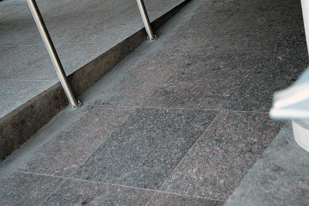 Мы видим входную группу маленького европейского отеля. Площадка перед зданием и пандус выполнены из популярного и проверенного временем гранита Tan Brown. Для отделки использовалась 2-сантиметровая плитка с термообработанной фактурой поверхности.