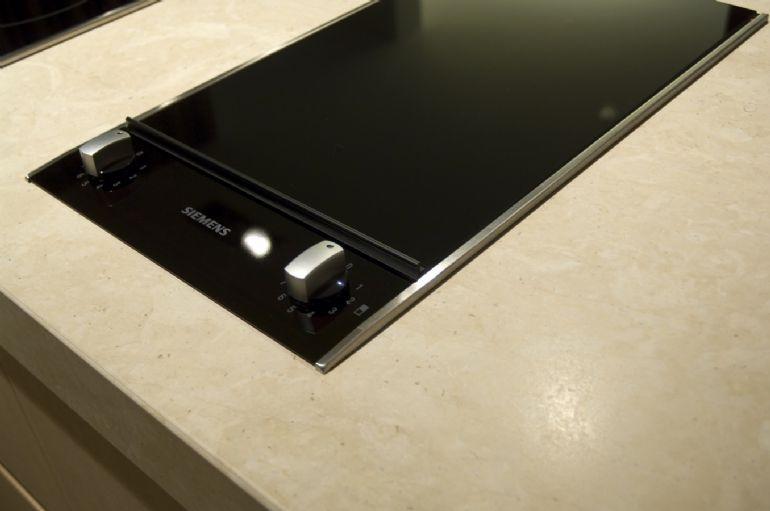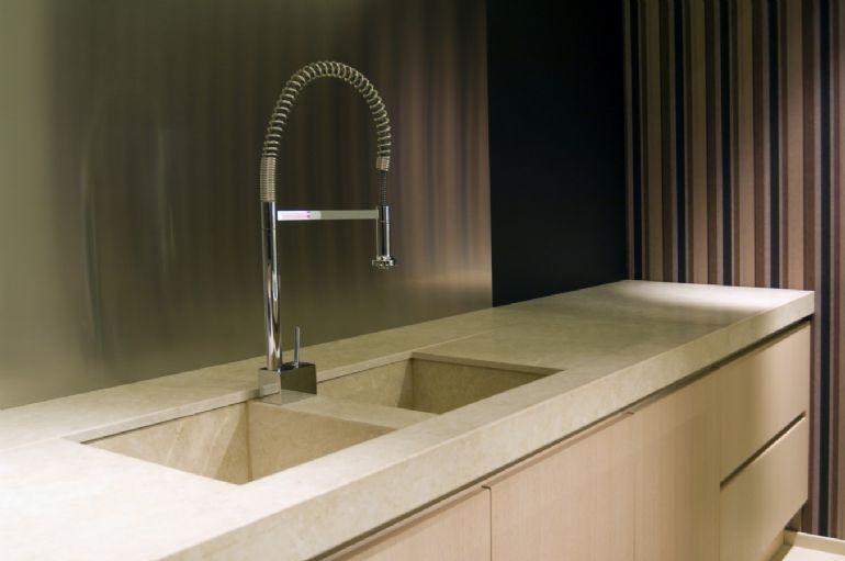 Тунисский известняк не часто применяется для создания мебели, но здесь дизайнер пошел на свой страх и риск. Не самый плотный и твердый камень на кухонном столе рискует потерять свой первозданный вид и даже целостность структуры.