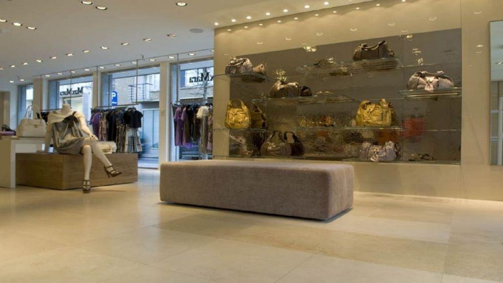 Пол магазина покрыт плиткой известняка Thala Beige - крепкого и привлекательного камня золотисто-бежевого цвета. Для пректа были использованы плиты с лощеной фактурой - с бархатистой поверхностью без блеска.