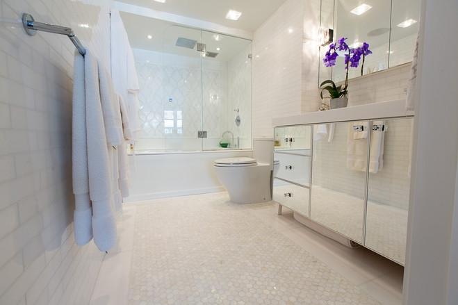 Проект белоснежной ванной комнаты. Пол и стены облицованы мрамором Thassos Pure White. Обратите внимание на напольную декоративную мозаику — она выполняет две функции: снижает риск скольжения на влажном мраморе и является достойным украшением.