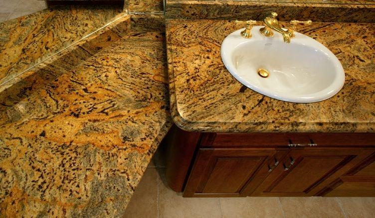 Ключевую роль в дизайне ванной комнаты играет гранит Tiger Skin Yellow. Из него изготовлены столешница под раковину и декоративная скамья. Необычный камень тигровой расцветки и динамичной текстуры позволяет создавать по-настоящему экзотичные интерьеры.