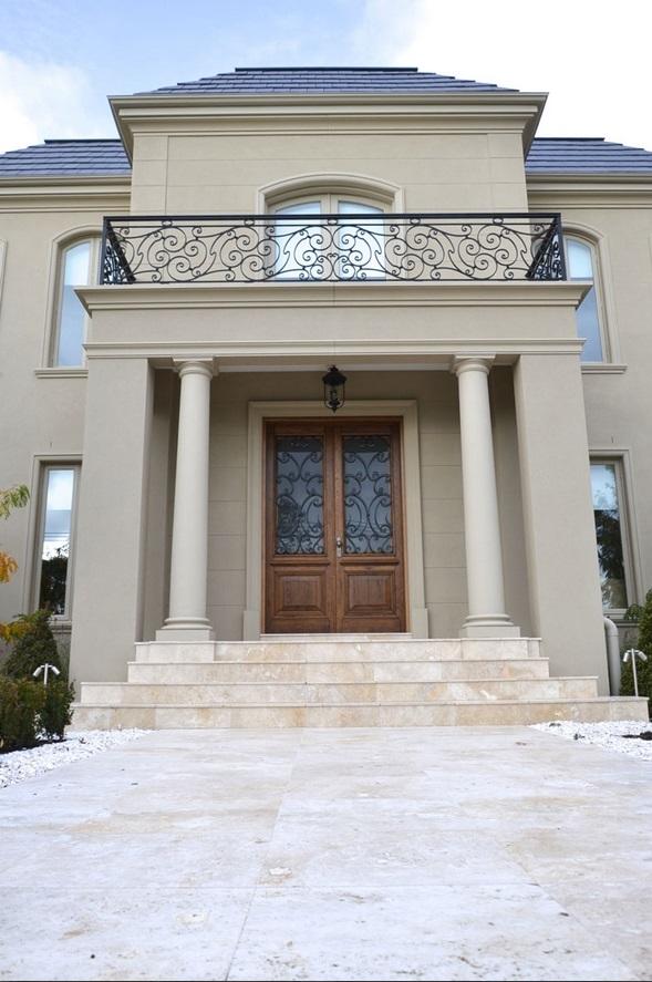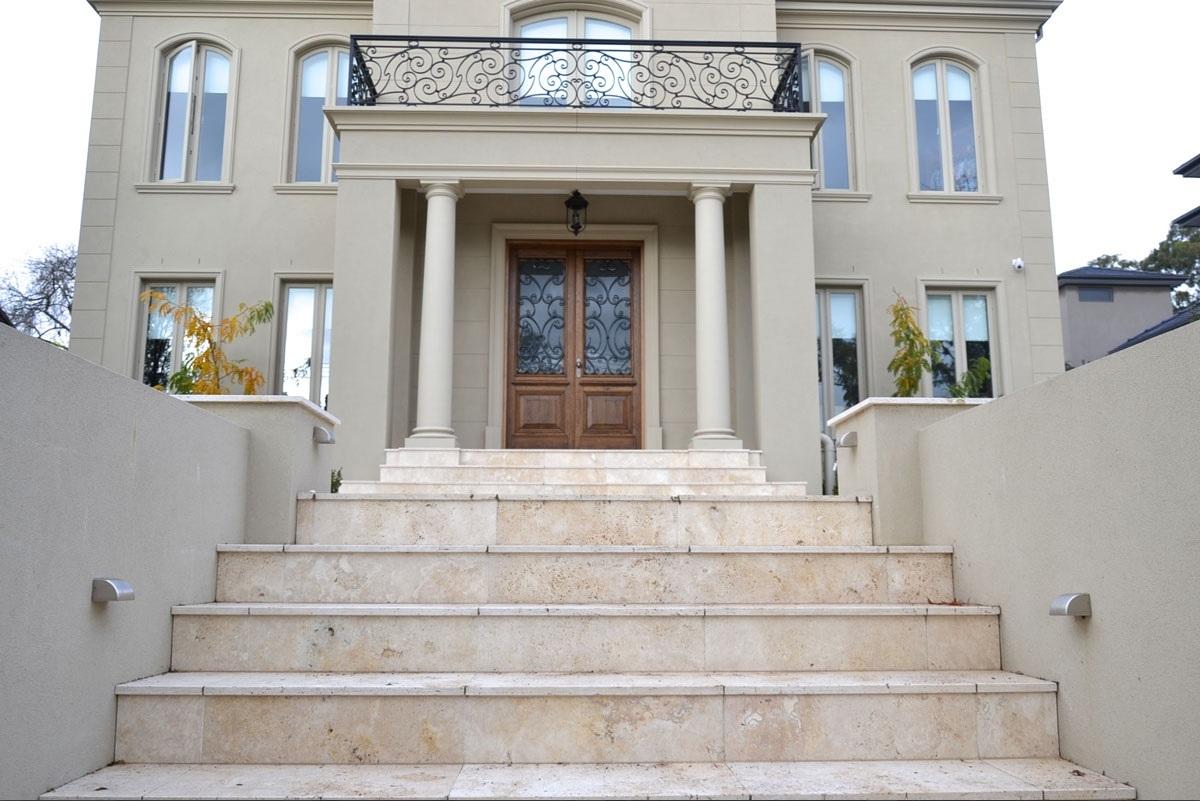 Для данного проекта было решено задействовать травертин не замастикованный, сохранивший естественные каверны и полости. Такой камень смотрится потрясающе, в духе "антик", но и требует бережного к себе отношения. Уличная грязь и влага заполняют поры камня, приводя к его старению и преждевременному разрушению.