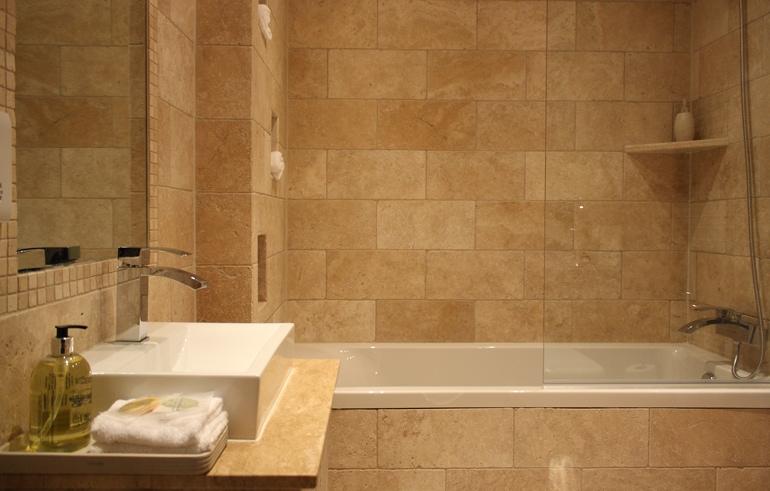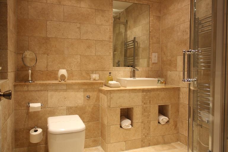 Обратите внимание на простую, но элегантную мозаику, декорирующую тумбу и зону вокруг зеркала. Она выполнена из маленьких фрагментов того же травертина.