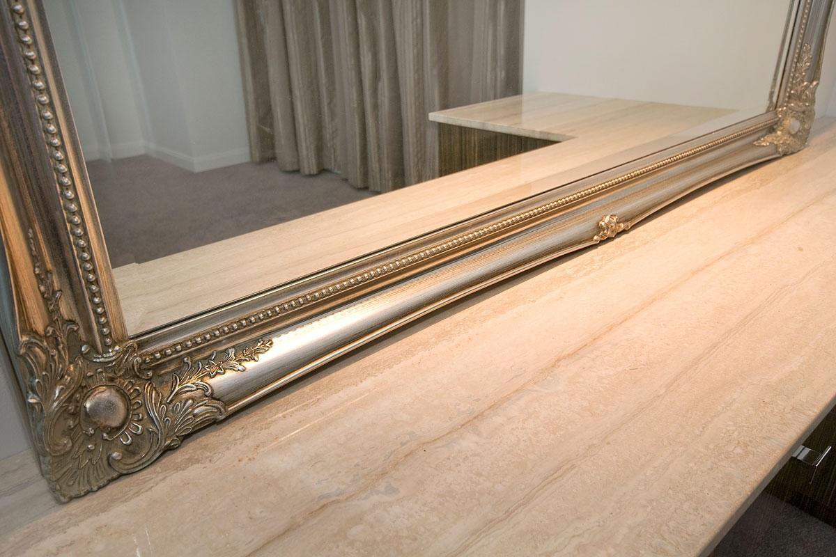Столешница покрывает тумбу туалетного столика Г-образной формы. Изделие вырезано из цельного 3-сантиметрового слэба полированного травертина Travertine Light, оно лишено стыков и швов. Рисунок камня волнисто-полосчатый, который раскрывается при распиле Vein Cut (направление распиловки от блока - вдоль прожилковатости). Такая текстура широко востребована по причине своей декоративной привлекательности.