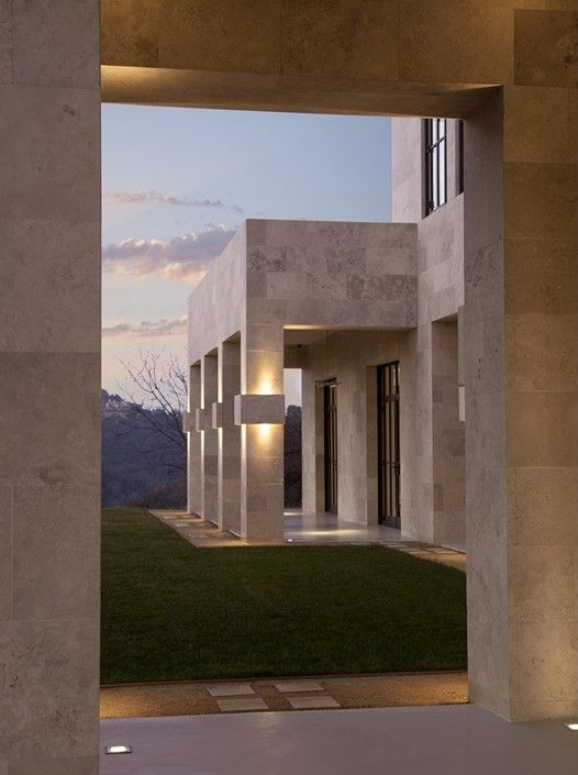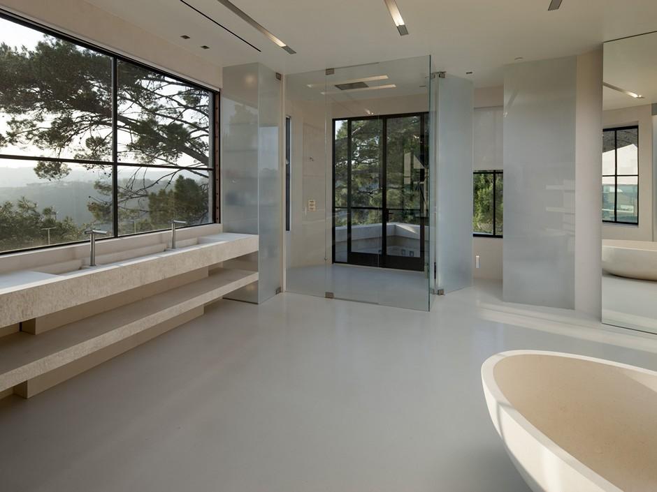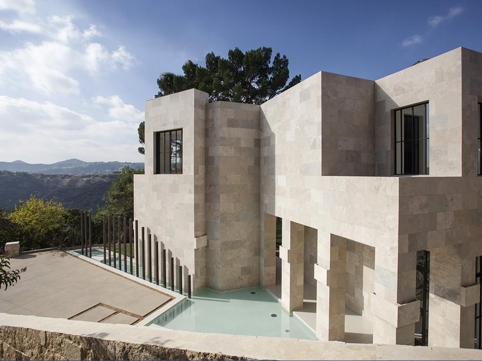 Это прекрасное монументальное строение окружено захватывающими дух панорамами каньона. Холмистая местность и отсутствие соседей позволили отказаться от возведения высокой ограды, отрезающией жильцов от природы. Да и дом спроектирован таким образом, чтобы не препятствовать распространению света и не закрывать природную панораму. Здание оснащено большими окнами и огромными выдвижными стеклянными стенами. Вся отделка характеризуется светлыми оттенками в белой и бежевой гамме, а также использованием натуральных материалов.