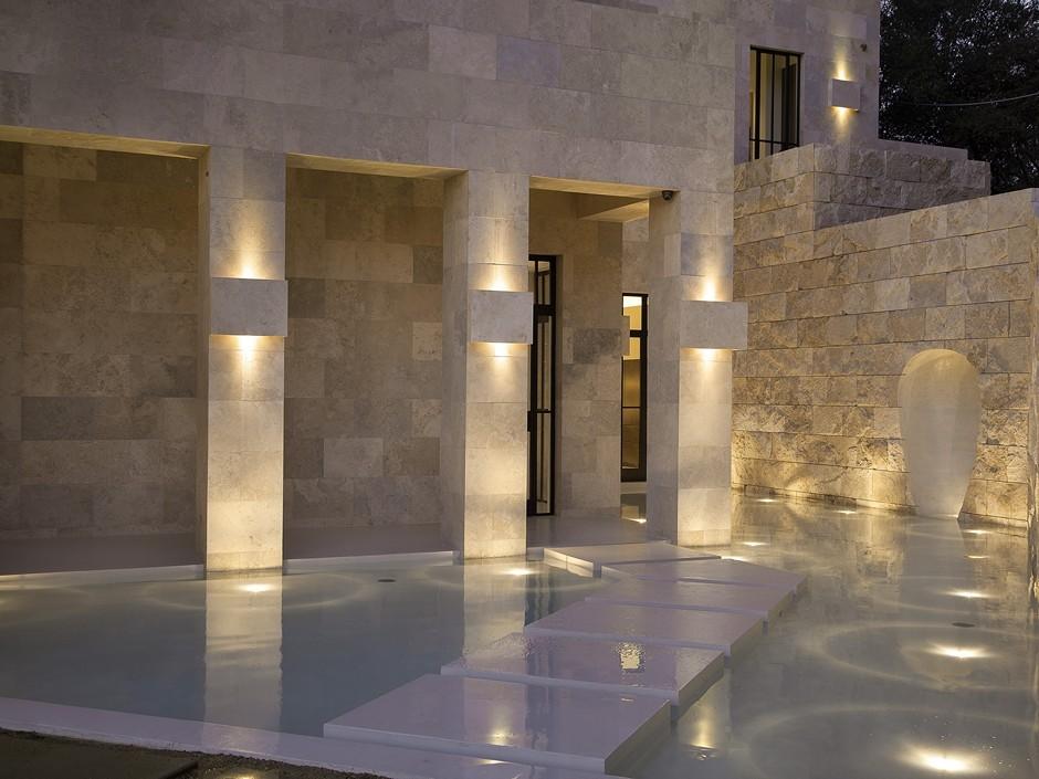 Фасад и придомовая территория облицованы светлым травертином сорта Travertine Light. Использовался камень в форматах крупной плиты и блоков нескольких фактур: полировка, лощение, колотая или "скала". В экстерьере травертином облицован весь фасад, колонны, низкое ограждение, дорожки, пространство вокруг бассейна. Из него выполнены пандусы и ландшафтные лесенки.