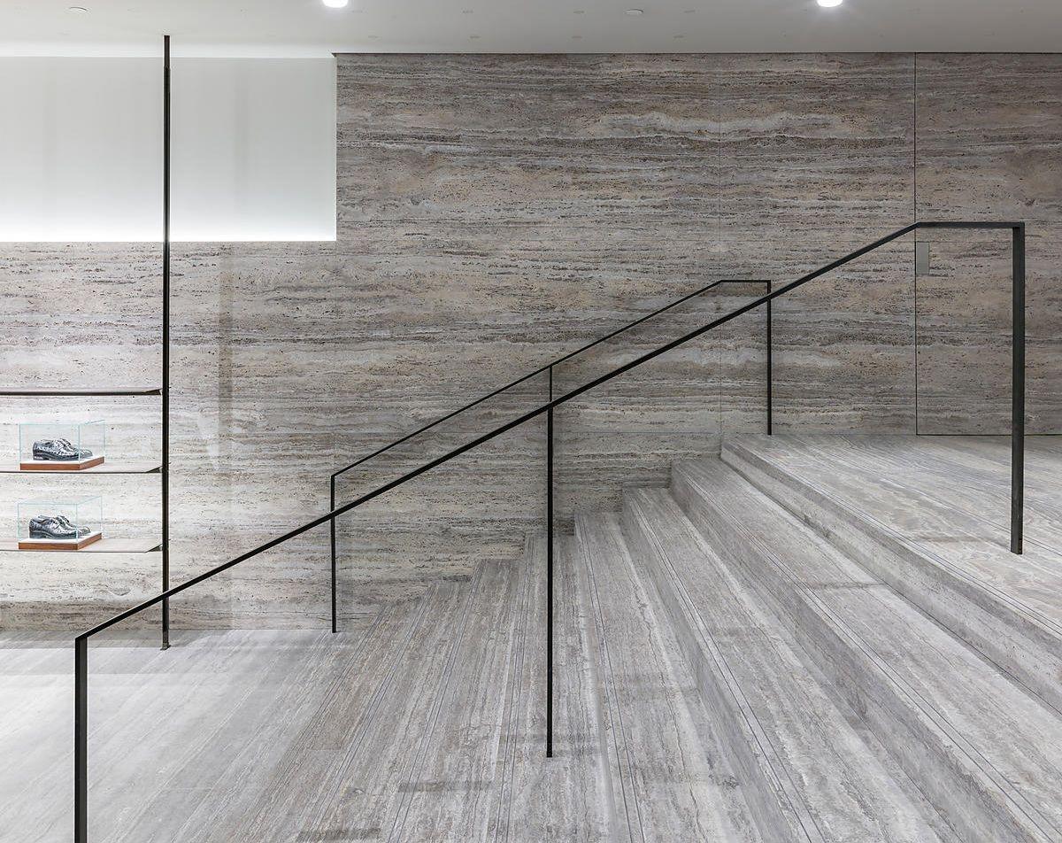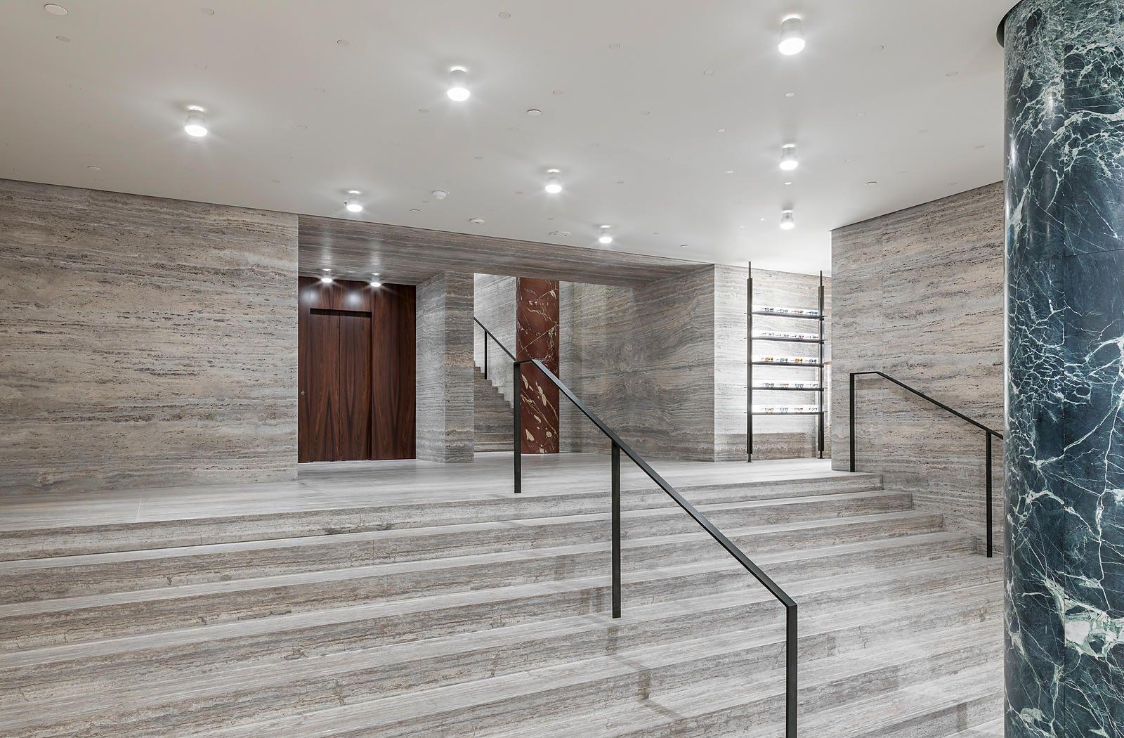 Стены, пол и лестницы покрыты крупными плитами итальянского травертина Travertino Striato. Этот камень обладает благородным серым оттенком и интенсивной полосчатостью (поскольку использовался метод распиловки Vein Cut). Камень пористый, с повышенным содержанием каверн. Дизайнер сохранил первозданный вид камня - живой, дышащий.