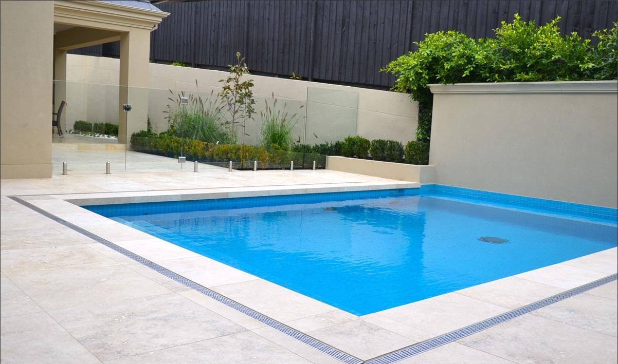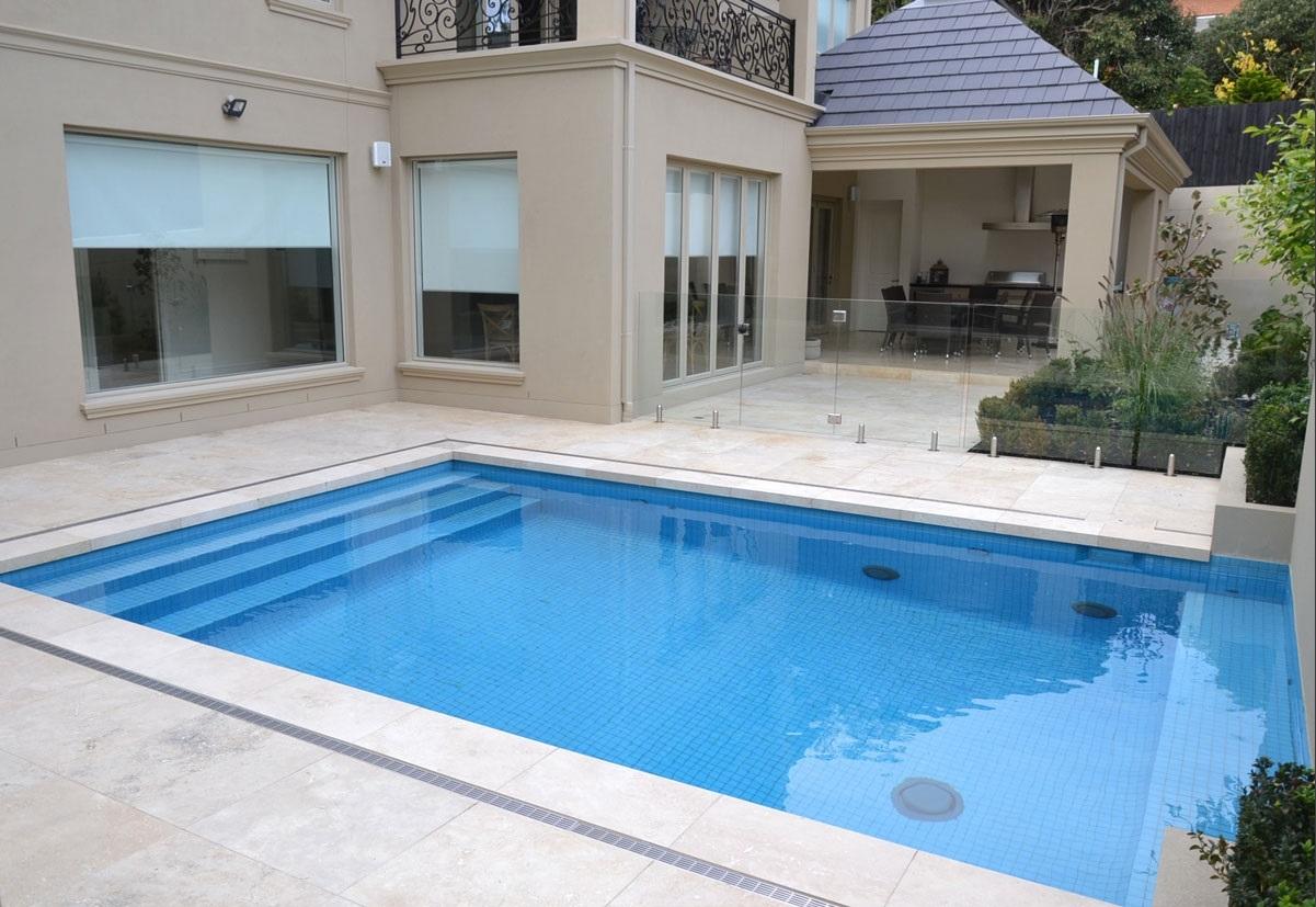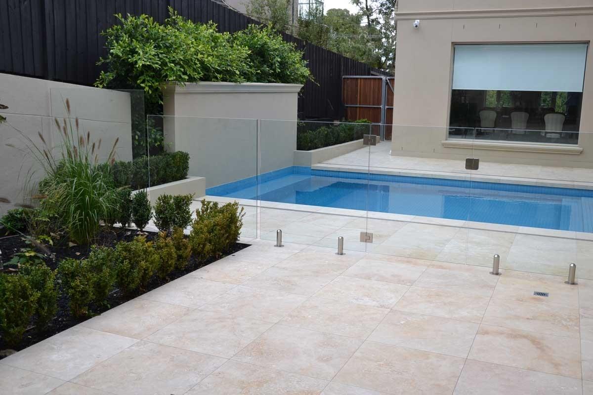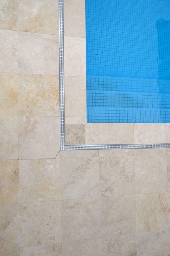 Территория во дворе частного дома облицована природным травертином с кремовым оттенком. В проекте использовалась плитка Travertine Cream с лощеной фактурой. Лощение смягчило тон камня до нежного розово-бежевого и придало ему равномерную бархатистую поверхность без блеска. К тому же лощеная поверхность снижает риск скольжения, что особенно важно при отделке бассейнов.