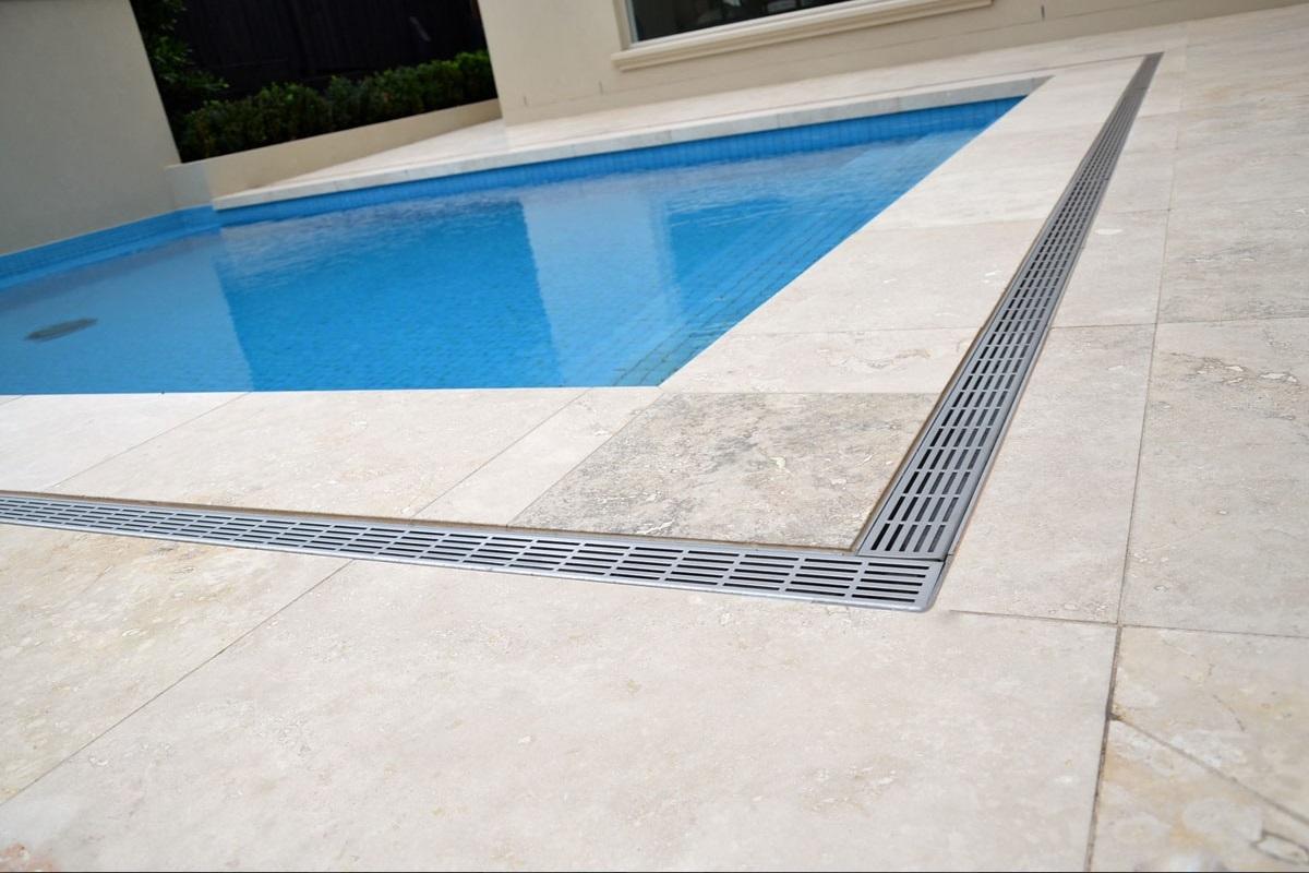 Этой плиткой облицована вся территория заднего двора: пространство вокруг бассейна, а также пол на террасе.