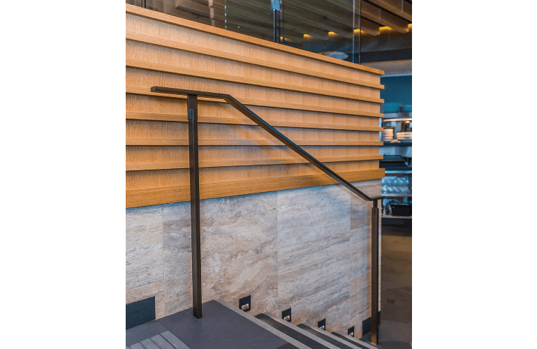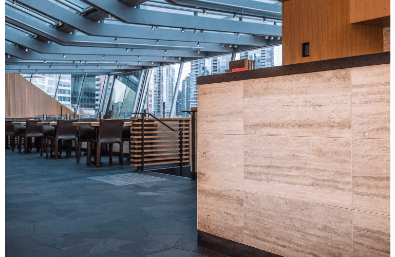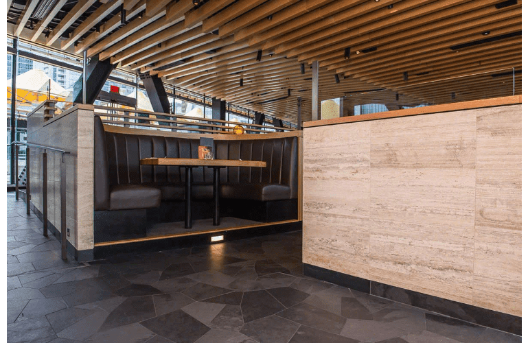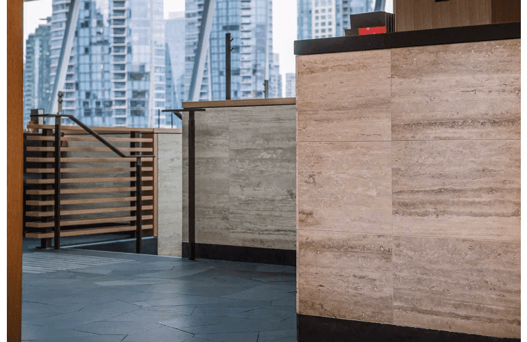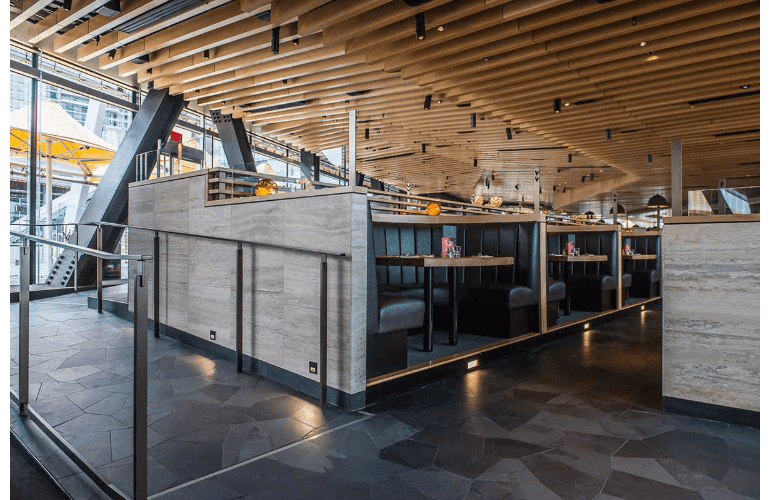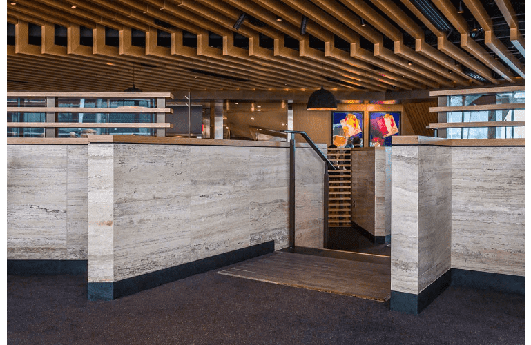 Стеновые панели, перегородки и фасады барных стоек облицованы плиткой итальянского травертина Travertino Striato. Для проекта была заказана крупная плитка с полосатым рисунком - метод распиловки Vein Cut. Этим же камнем облицованы балюстрады лестниц.