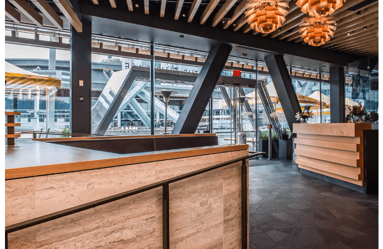 Перед нами интерьер современного европейского ресторана. Помимо удачного расположения на реке, заведение интересно и своим дизайном. Который воплощен с помощью натуральных материалов и сплошных панорамных окон.