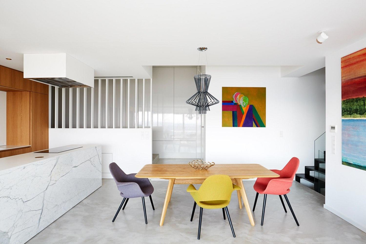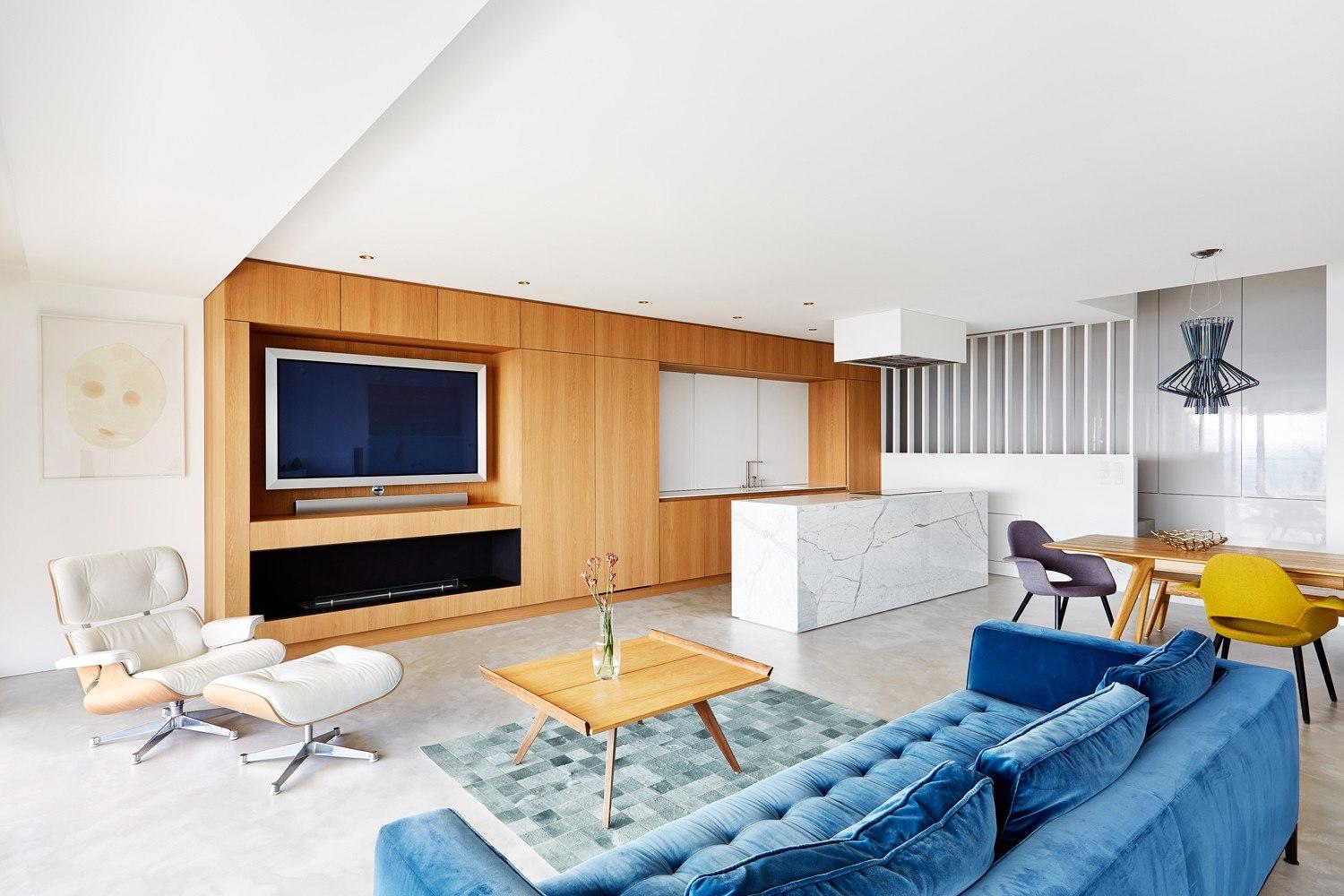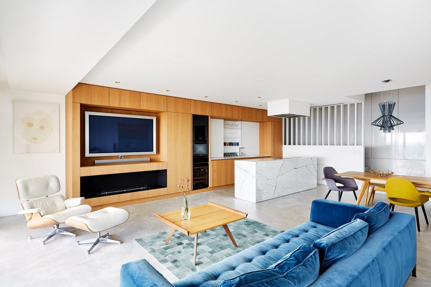 Данный проект интересен тем, что горизонтальная поверхность столешницы выполнена из белого акрилового камня. Это весьма разумное решение, поскольку такое поерытие почти невозможно повредить или оставить темное пятно.